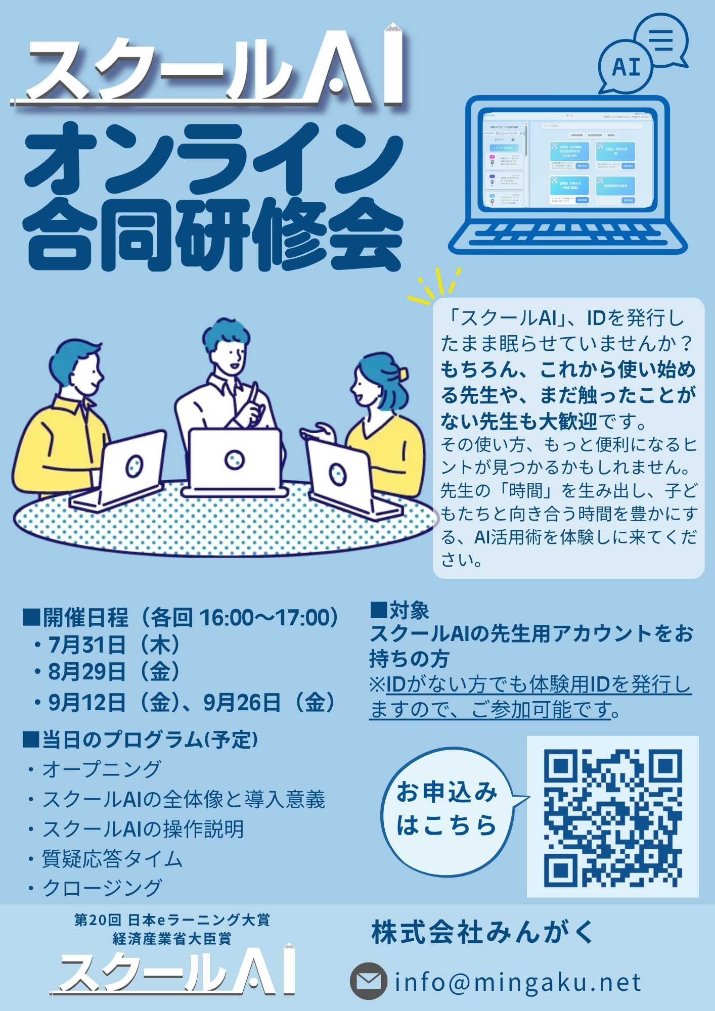 このたび、スクールAIをご紹介・ご利用のみなさま、および導入ご検討中のみなさまを対象に、基本的な機能や使い方を紹介するオンライン合同研修会を開催いたします。